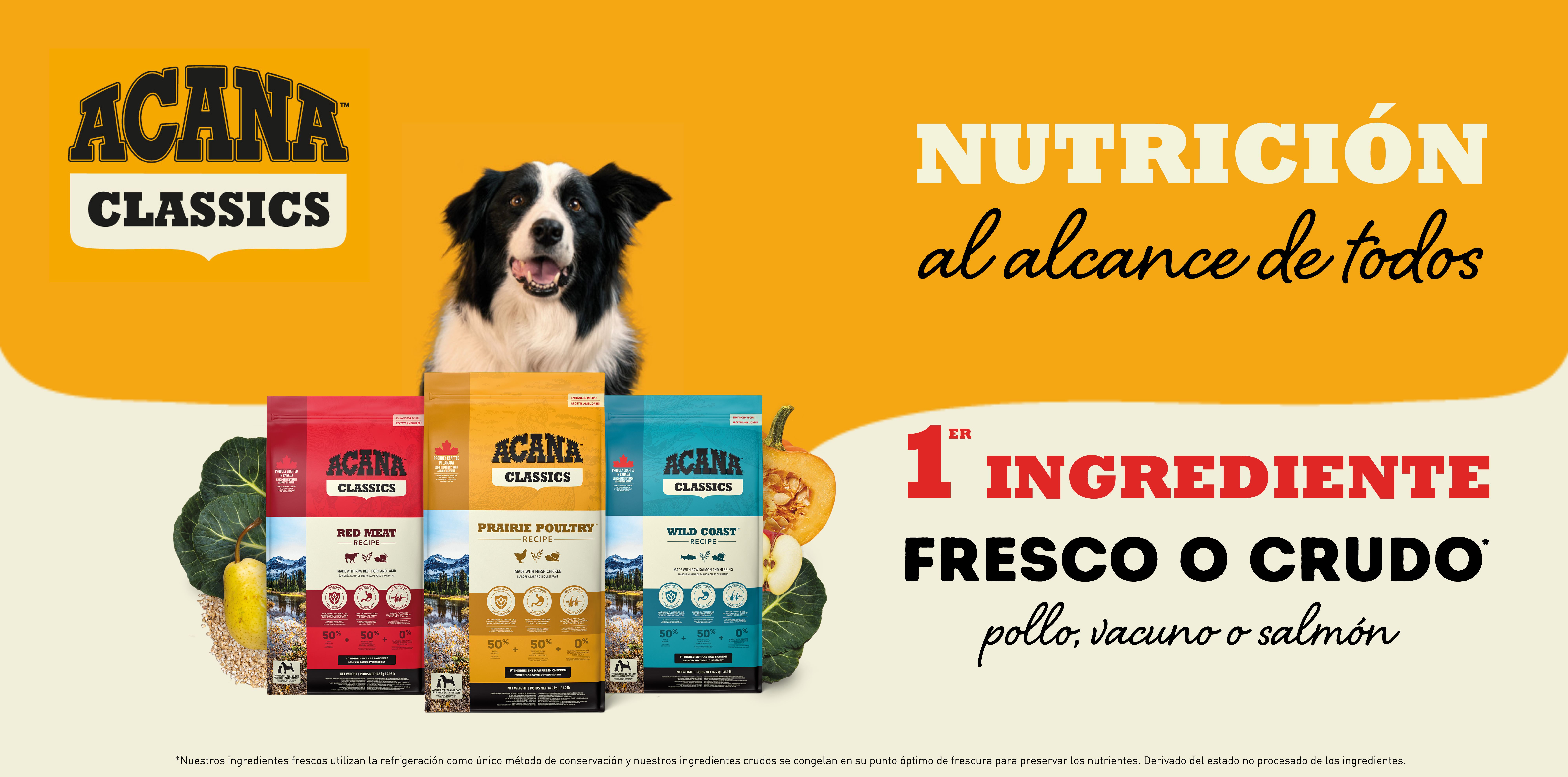 Con un 50% de ingredientes de origen animal de calidad y un 50% de frutas, verduras y cereales saludables, la gama Classics de ACANA contiene gran cantidad de proteínas de origen animal y todos los nutrientes y vitaminas que perros de todas las razas necesitan para cuidar de su salud en todas las etapas de la vida.